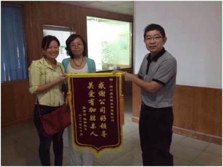 近日,長(zhǎng)期患有尿毒癥的后勤部員工張亦斌的愛(ài)人陳嬌為我司送來(lái)了一面題為“感謝公司好領(lǐng)導(dǎo),關(guān)愛(ài)有加勝親人”的錦旗,以此感謝這些年公司對(duì)她家庭予以的幫助。