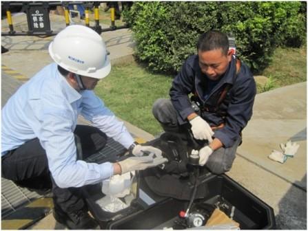 室外現(xiàn)場實操部分的學(xué)習(xí),選擇在污水處理廠A組沉淀池3號閥門井開展,參加學(xué)習(xí)的人員,統(tǒng)一穿戴安全防護(hù)用品,在培訓(xùn)師的清晰示范講解下,按照各自的模擬角色進(jìn)入受限空間模擬演練,四月的??谠缫褯]有了春的涼爽,炎炎烈日掛在湛藍(lán)的天空,雖然參加學(xué)習(xí)的人員各個都汗流浹背可是在學(xué)習(xí)技能的面前沒有一人因天氣炎熱而退縮,而只有掌握過硬的技能,這樣才能在操作時得到安全的回饋。