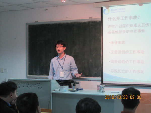 圖1:10月28日環(huán)保健康安全部范經(jīng)理為大家講解工傷事故預防