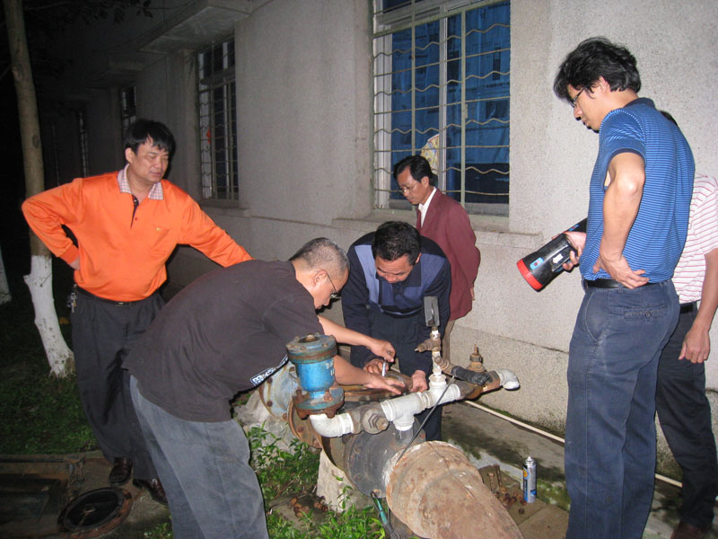剛到車(chē)間值班室時(shí)大家都是一臉的沉重,果真,1#機(jī)井出水壓力指針僅停留在1.5bar處,而不遠(yuǎn)處的2#機(jī)好像在呼呼喘氣似地,按下啟動(dòng)開(kāi)關(guān),沒(méi)有動(dòng)靜,再按一次,依然還是沒(méi)有動(dòng)靜,這時(shí)陳廠長(zhǎng)根據(jù)他多年在一線(xiàn)的經(jīng)驗(yàn)判斷應(yīng)該是止回閥出了問(wèn)題,停機(jī)后由于管網(wǎng)中的水倒灌入機(jī)井而引起的故障。他嘗試著把蝶閥給關(guān)住,因?yàn)殚y門(mén)很緊,他使出全身的勁,轉(zhuǎn)了幾十圈,才終于把閥門(mén)完全關(guān)閉了。同時(shí)我們將此事報(bào)告給了梁總,他讓我們嘗試著通過(guò)變頻器來(lái)啟動(dòng)機(jī)井看看,然后再將蝶閥慢慢地打開(kāi),我們照著做,終于從排氣閥處噴出了水柱,原來(lái)這樣做的目的就是為了不要給機(jī)泵帶來(lái)太大的沖力,我們不得不佩服,畢竟姜還是老的辣呀。此時(shí)1#機(jī)井的出水壓力也上升到了3.0bar,原來(lái)當(dāng)2#機(jī)井關(guān)閉后,1#機(jī)井的出水有一部分倒流到2#機(jī)井。原因終于找到了,大家都松了一口氣,可問(wèn)題又來(lái)了,如果到天亮?xí)r都不能修好的話(huà),怎么辦?此時(shí),機(jī)修人員也都趕到了,來(lái)不及客套,大伙馬上投入了緊張的工作。行政部負(fù)責(zé)送水的同志也趕到了現(xiàn)場(chǎng)待命,大家也不分什么部門(mén)什么崗位,因?yàn)檫@個(gè)時(shí)候,我們都只是海口威立雅的一員,我們所做的就是履行我們威立雅對(duì)所有用戶(hù)所承諾的 “從心出發(fā),服務(wù)萬(wàn)家 ” ,負(fù)責(zé)照明的拿著手電筒,噴機(jī)油的噴機(jī)油,拆螺絲的拆螺絲……大伙都卯足了勁,一定要在天亮前將故障修復(fù)。經(jīng)過(guò)大家的共同努力,終于將故障的止回閥修復(fù)好,并安裝回去,一試機(jī),OK,大伙都笑了,而此時(shí),時(shí)鐘已經(jīng)悄悄地走到了5:20,醫(yī)院里面也即將迎來(lái)每天的用水高峰。