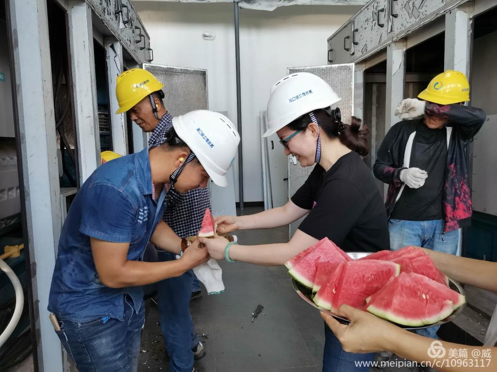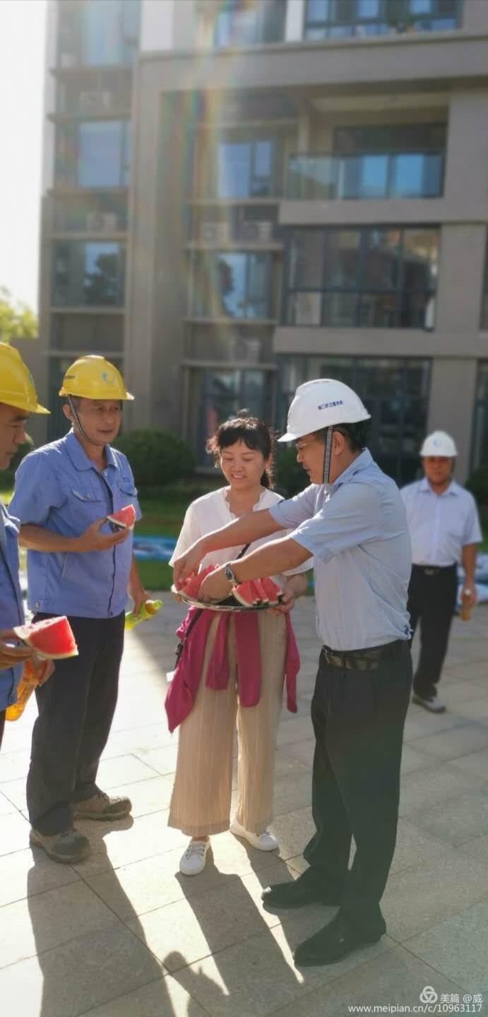 董事長孫傳志給現(xiàn)場工作人員送上防暑降溫的西瓜 副總經(jīng)理趙春華為現(xiàn)場工作人員送上西瓜
