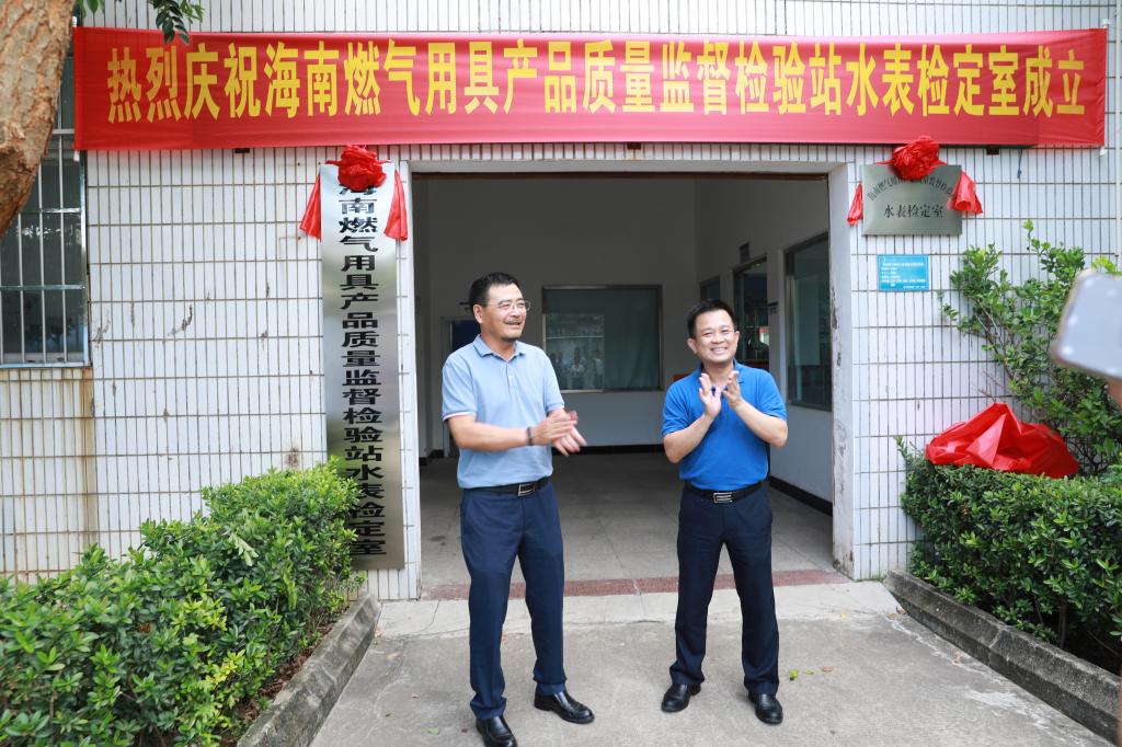 ??谕⒀潘畡沼邢薰究偨浝硖飫偅ㄗ螅?、海南益正聯(lián)合建工集團總經理林少海(右)為海南燃氣用具產品質量監(jiān)督檢驗站水表檢定室共同揭牌。