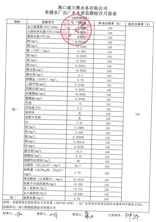 2021年5月??谕⒀潘畡?wù)有限公司米鋪水廠出廠水水質(zhì)監(jiān)測月報(bào)