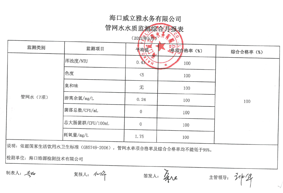 2021年5月??谕⒀潘畡?wù)有限公司管網(wǎng)水水質(zhì)監(jiān)測(cè)月報(bào)