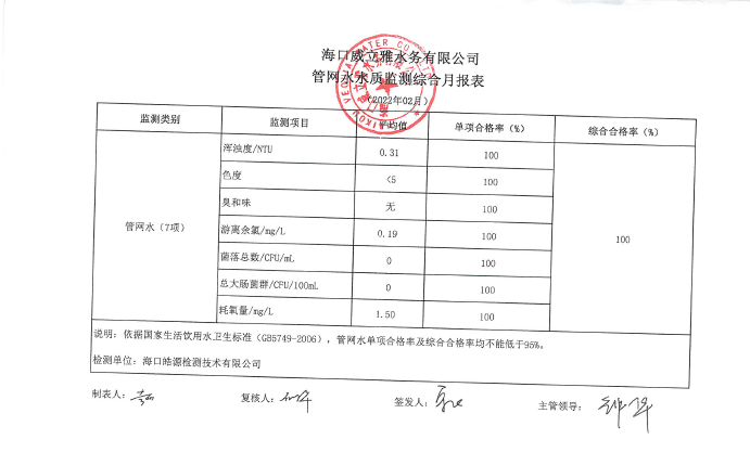 2022年2月海口威立雅水務(wù)有限公司管網(wǎng)水水質(zhì)監(jiān)測月報(bào)