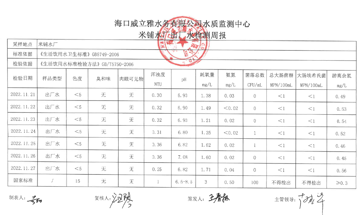 2022年11月米鋪水廠出廠水檢測(cè)周報(bào)(11.21-11.27)
