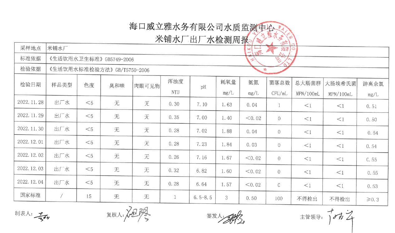 2022年11月米鋪水廠出廠水檢測周報(11.28-12.04)