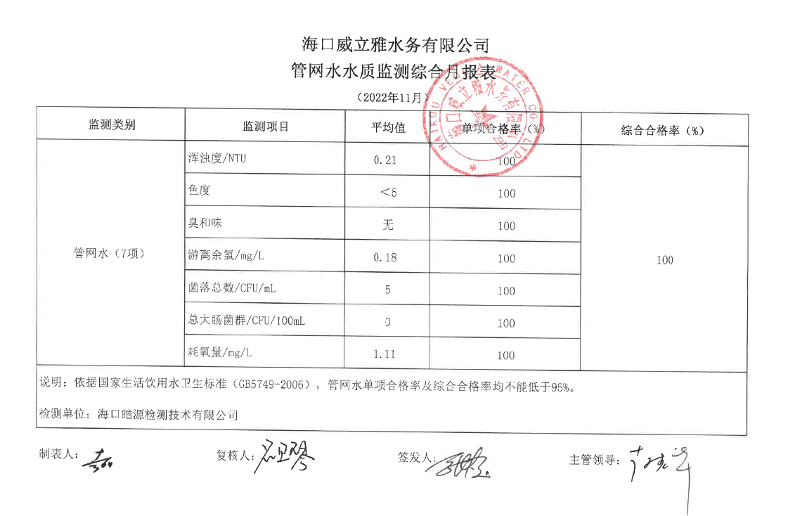 2022年11月海口威立雅水務(wù)有限公司管網(wǎng)水水質(zhì)監(jiān)測月報