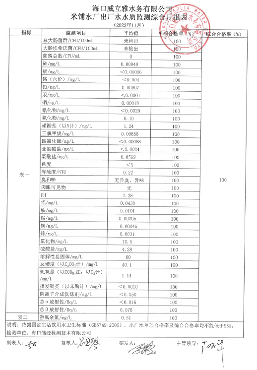 2022年11月??谕⒀潘畡?wù)有限公司米鋪水廠出廠水水質(zhì)監(jiān)測月報(bào)