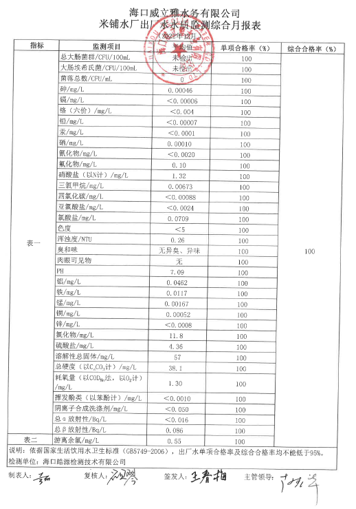 2022年12月海口威立雅水務(wù)有限公司米鋪水廠出廠水水質(zhì)監(jiān)測(cè)月報(bào)