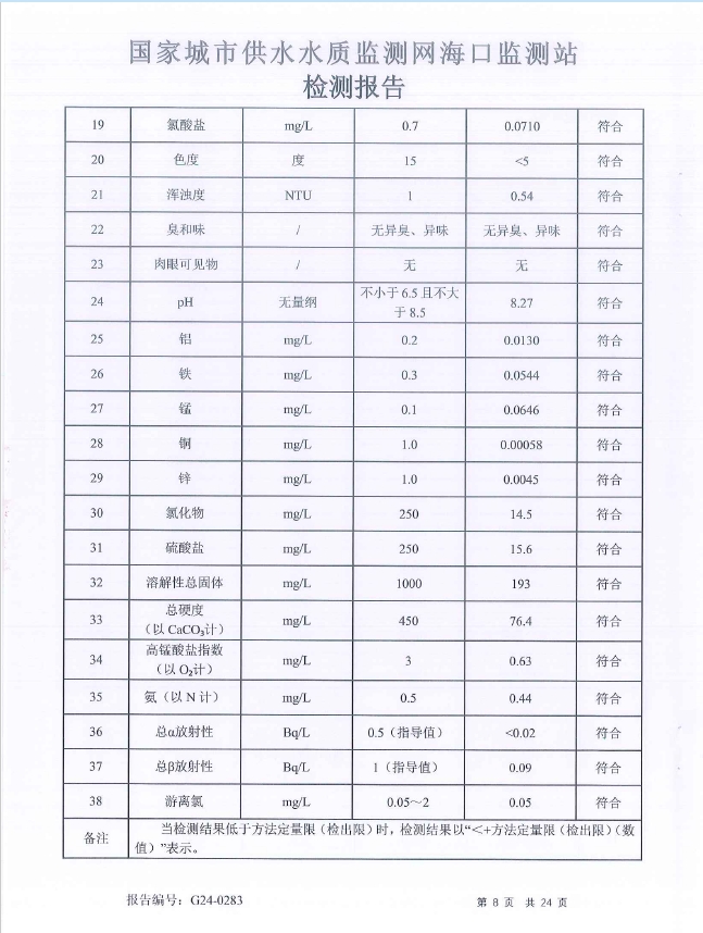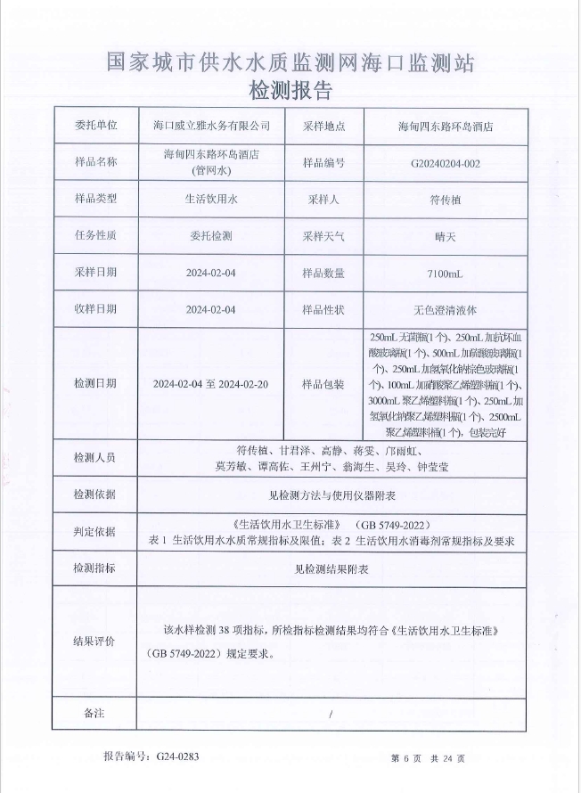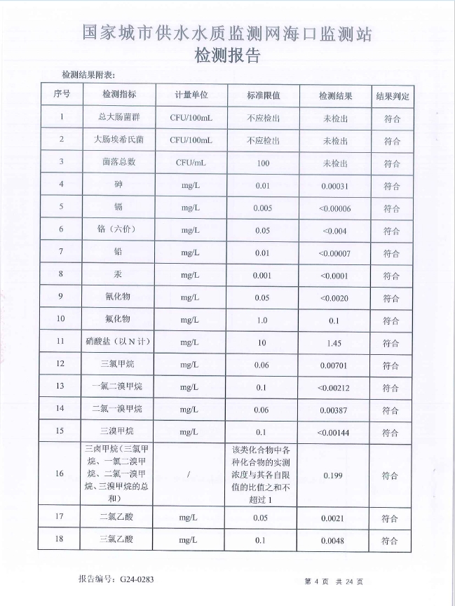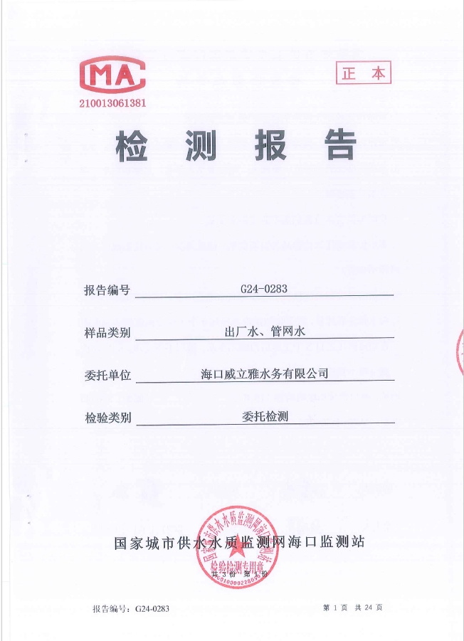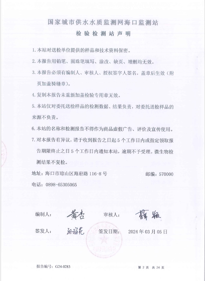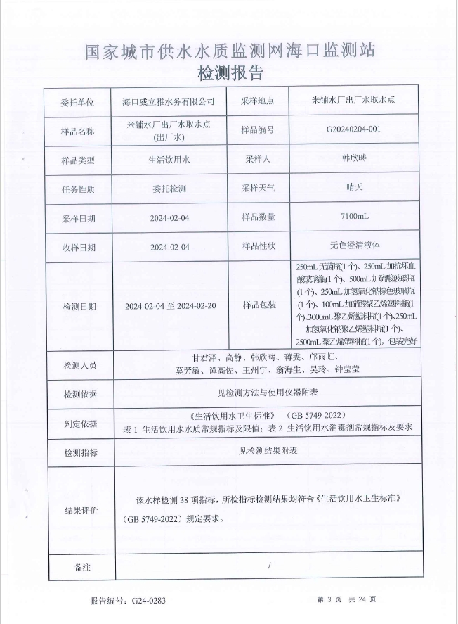 2024年2月海口威立雅水務(wù)有限公司米鋪水廠(chǎng)出廠(chǎng)水、管網(wǎng)水月檢報(bào)告