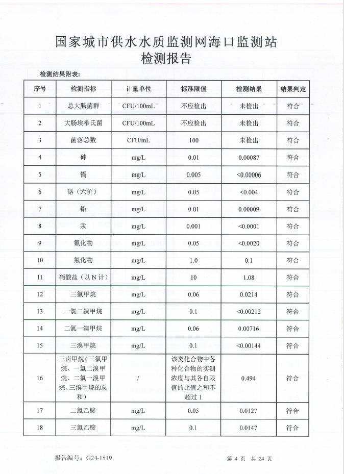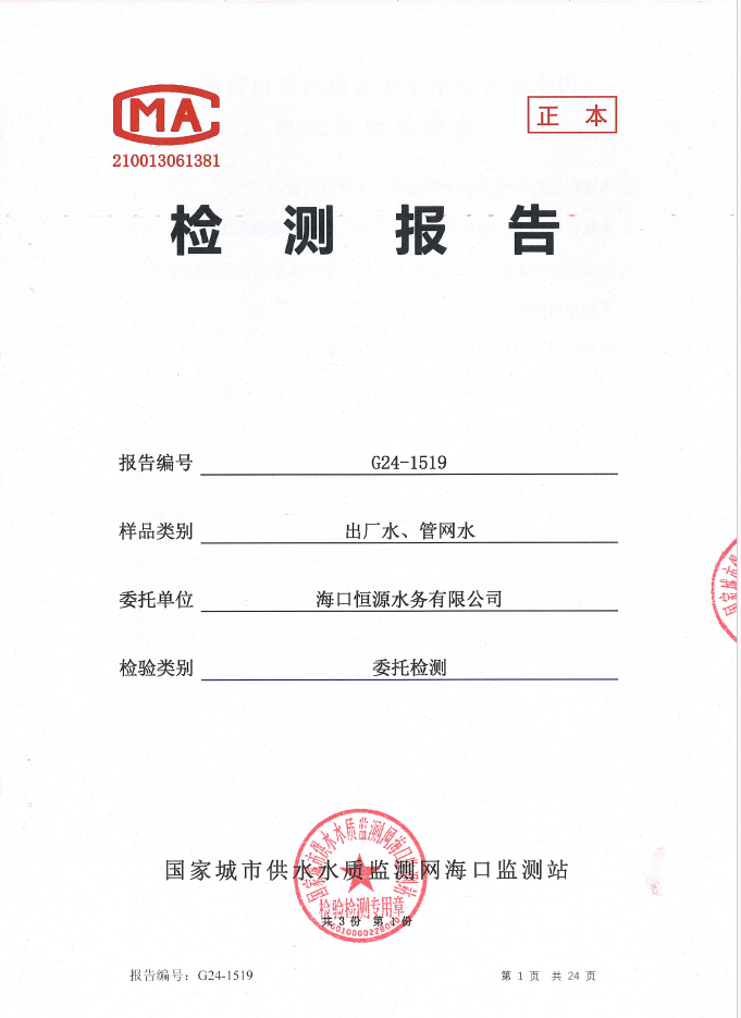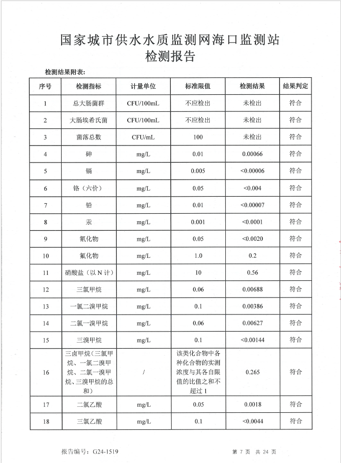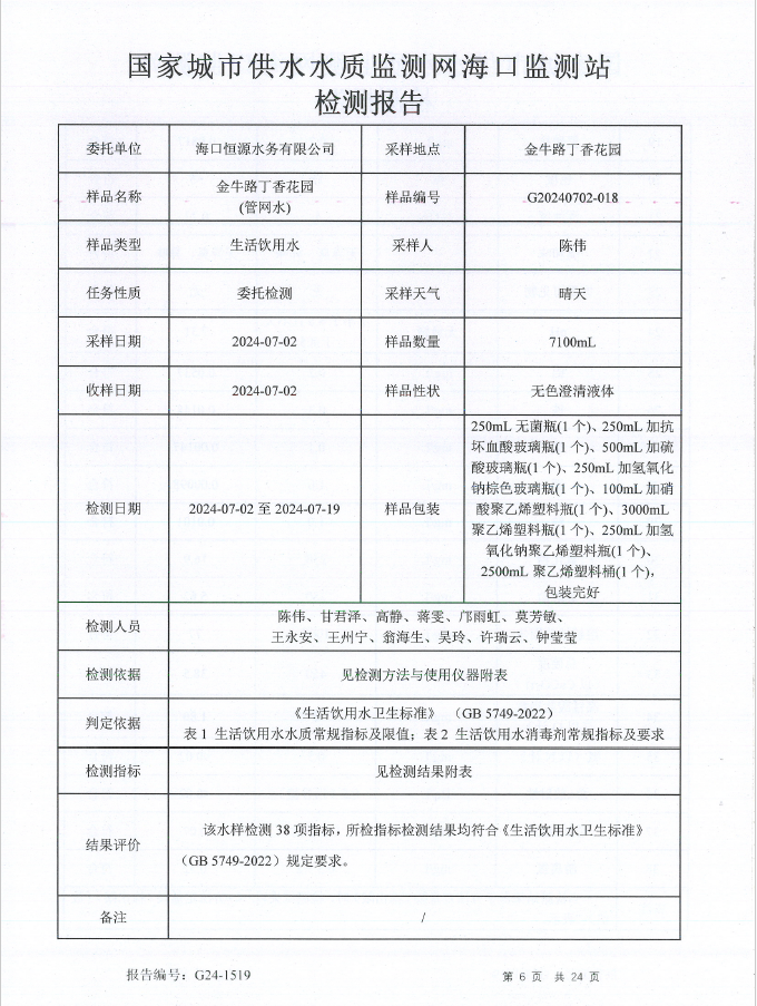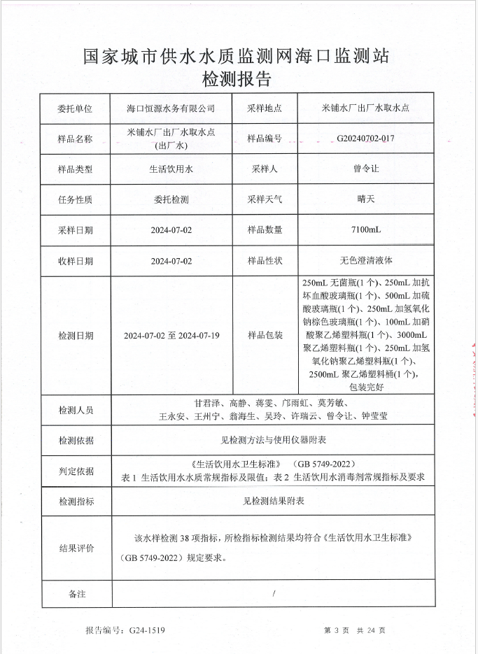 2024年7月恒源水務(wù)有限公司米鋪水廠出廠水、管網(wǎng)水月檢報(bào)告
