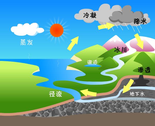 水循環(huán)沒有起點,但是海洋是一個開始水循環(huán)的好地方。太陽驅(qū)動著整個水循環(huán),首先使海洋里的水升溫,一部分水變成水蒸氣,蒸發(fā)到空氣中。淡水湖和江河中同樣也存在著蒸發(fā)現(xiàn)象。在陸地上,從植物和土地上蒸騰的水分同樣也變成水蒸氣,蒸發(fā)到空氣中??諝庵猩倭康乃畞碜杂谏A,也就是由冰和雪直接蒸發(fā)變成水蒸氣,完全省略了融化過程。上升的氣流將水蒸氣帶到大氣層中,在大氣層中由于溫度較低,水蒸氣又凝結(jié)后變成云。氣流驅(qū)使著云圍繞地球運動,云顆粒互相碰撞、不斷擴(kuò)大并且變成降水從空中落下。有些水分以雪的形式降落,可堆積變成冰帽和冰川。當(dāng)春回大地氣候變暖時,雪通常會融化,積雪融水沿地面形成融雪徑流。雖然大部分降水都回到海洋,但仍有一些降落到了陸地上,由于地心引力,沿地表流動形成地表徑流。
