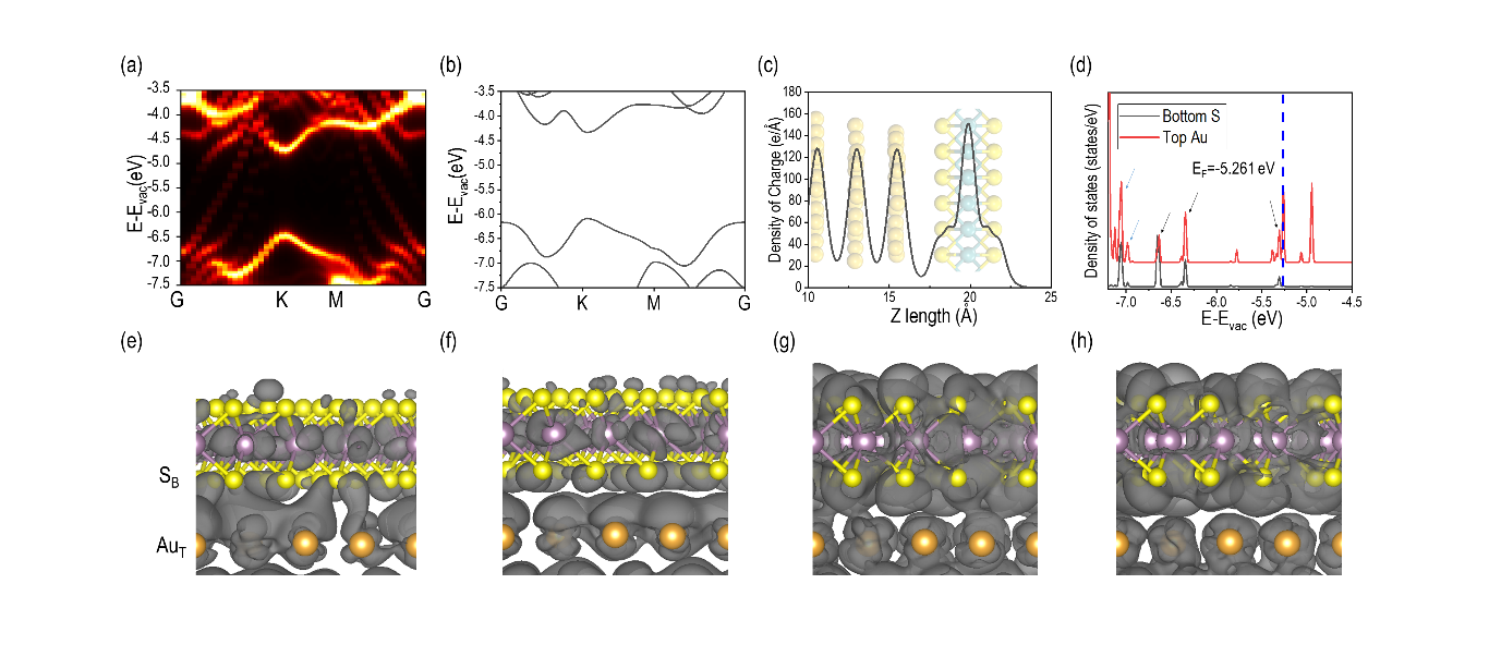 图1. MoS2与Au(111)相互作用的电子结构分析。(a-b)在Au(111)上(a)及独立(b)的单层MoS2能带结构;(c)MoS2/Au(111)界面差分电荷密度沿垂向的谱线图;(d) MoS2/Au(111)界面附近的S原子和Au原子的态密度分布图;(e-h) 位于态密度分布图-7.0