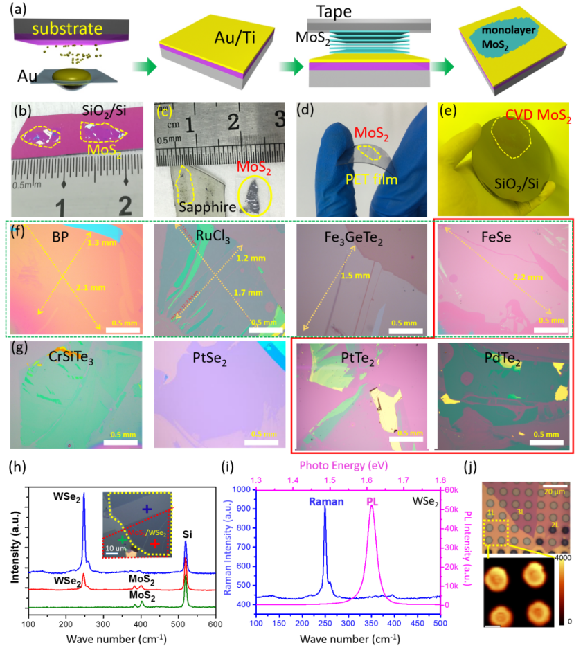 图3. 机械解理获得多种大面积高质量超薄二维材料。 (a) 新型机械解理的步骤; (b-e) 不同基底上解理得到的大面积MoS2; (f-g) 解理得到的多种大面积二维材料; (h-j) 异质结及悬空二维材料的拉曼光谱及荧光光谱。