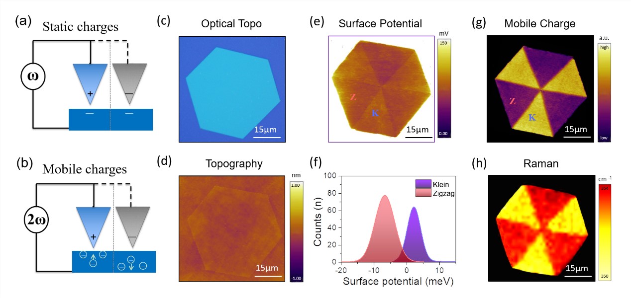 图2 (a-b)多频静电力显微术原理示意图。(c-d)单层WS2单晶的光学与原子力显微镜形貌图。(e-h)WS2表面电势、载流子和拉曼成像图。