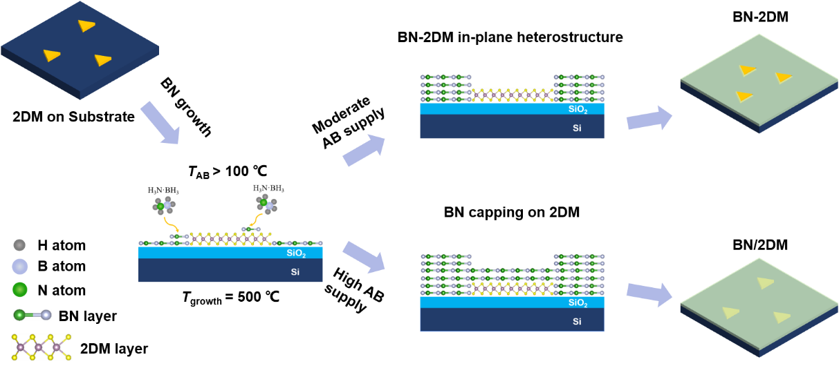 图1. 选择性生长a-BN与2D材料面内或垂直异质结构示意图。