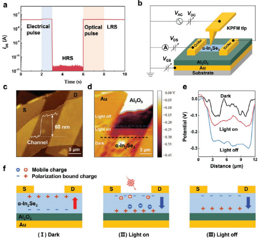 图2. 铁电半导体光电晶体管的低温原位KPFM表征及其光诱导铁电转换模型。