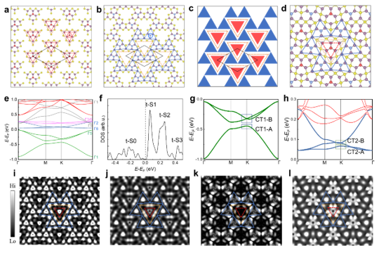 程志海及合作团队利用MoTe2单层中最小的闭合镜像孪晶界(mirror-twin boundary, MTB)三角形(MTB loops),通过顶角——边相邻的超结构排列方式,理论设计了一种新型着色三角形单层材料CT-MoTe2。理论预测表明,该单层材料具有较好的热稳定性和多套笼目电子能带,其中包含一条位于费米能级附近(+0.04 eV)的孤立拓扑平带。随后,团队利用分子束外延技术制备出了该单层材料,使用扫描隧道显微镜测量了其不同偏压下的形貌、不同晶格位置的电子能态密度和不同能量下的电子态实空间分布图像。这些测量表征结果发现了在费米能级附近1 eV内具有四套笼目电子结构,包括一条在费米能级附近(+0.05 V)的平带,与理论预测一致。此外,研究团队还发现,CT-MoTe2具有两种不同周期的电子结构(Janus electronic lattices),使其表现出两种在不同偏压下性质迥异的畴界。该研究以原子簇为基元,通过超结构设计、实验制备和性质测量,在一定程度上初步实现了材料的按需创制,为探索原子级制造中按需创制任意材料的实现方案提供新线索。