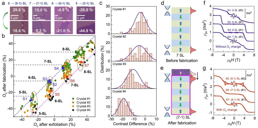 图:微纳加工过程对光学对比度和输运行为的影响。a,机械剥离后四个代表性样品在接触PMMA前后的光学照片。b,对223块MnBi2Te4样品接触PMMA前后的光学对比度Oc的总结,不同颜色表示来自不同晶体的数据。c,四种不同方法生长的晶体中获得的样品Oc变化分布,在对PMMA最敏感的晶体中,微加工可能引起相当于1层的对比度变化。d-e,厚度为7层的MnBi2Te4在接触PMMA前后表面电子结构变化示意图。f-g,不同层厚MnBi2Te4样品磁场下的霍尔效应,其中蓝色表示不受PMMA影响的样品,其输运行为与理论预期的奇偶振荡一致,红色表示受PMMA显著影响的样品,其奇数层表现出零级平台,偶数层表现出反常霍尔回滞。
