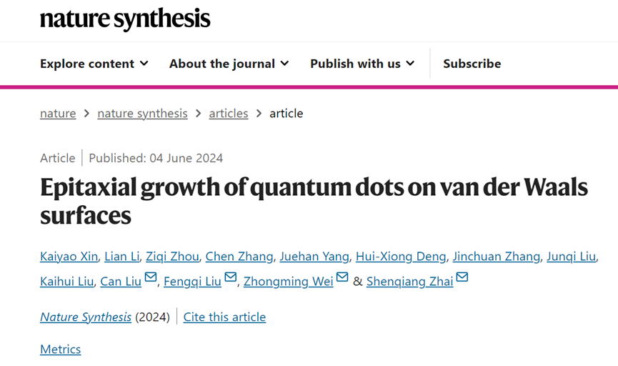 yl7703永利集团官网物理学系、量子态构筑与测控教育部重点实验室刘灿副教授与中国科公司半导体研究所翟慎强研究员、魏钟鸣研究员、刘峰奇研究员,北京大学刘开辉教授等团队合作,提出二维界面范德华外延半导体量子点(QD)新策略,突破了传统量子点晶格匹配外延限制,实现了多类III–V族、IV–VI族本征量子点的通用制备。2024年6月4日,相关成果以“Epitaxial growth of quantum dots on van der Waals surfaces”为题,在线发表于《自然·合成》(Nature Synthesis)。