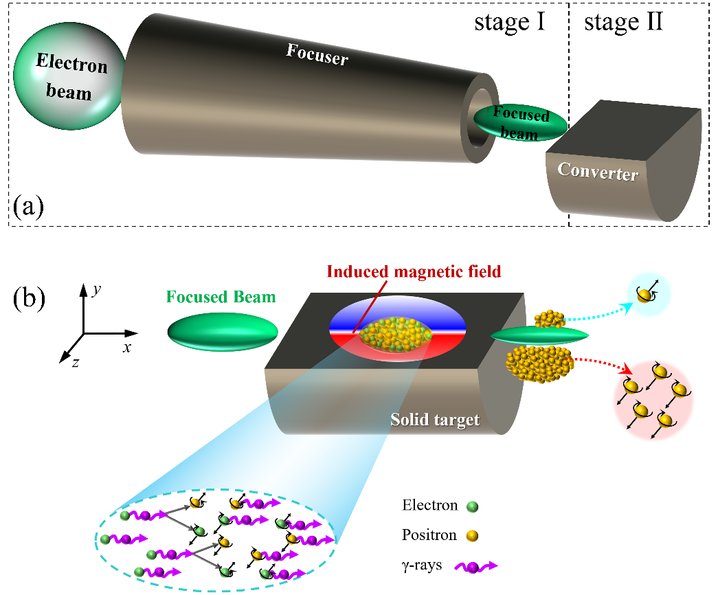 图1. (a)物理方案原理图,包括电子束聚焦和正电子产生。(b)稠密极化正电子产生机制图。