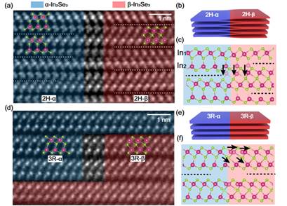宏观的电输运测量和微观电子显微观测从实验上证实了堆叠结构影响对铁电畴壁动力学的行为调控作用。理论计算结合实验观测表明,在高电场条件下,α-In2Se3从铁电相到顺电相变过程中,原子位移的动力学行为对层堆叠方式具有强烈依赖性(图2)。在3R型堆叠中,α-In₂Se₃在热力学和动力学因素共同作用下,通过层内原子滑动实现相变;而在2H型中,α-In₂Se₃则在热力学因素主导下经历层内断键和层间成键等复杂过程进行相变。