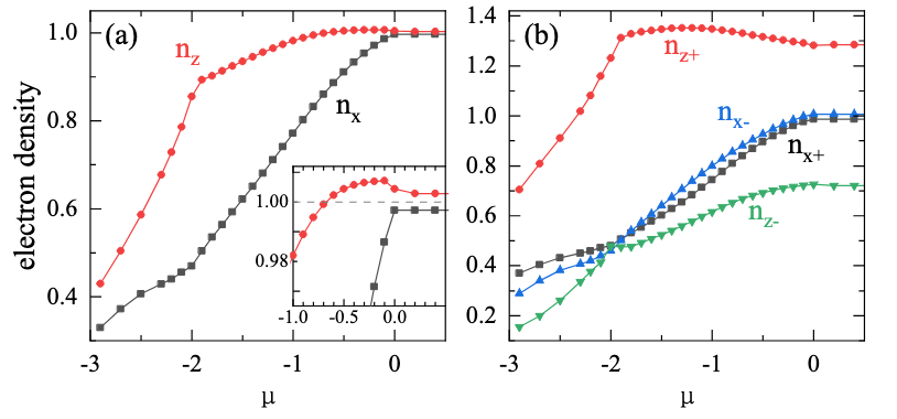 电子密度随化学势的演化直观展示了两个轨道的强纠缠特性。随着填充数趋近半满,两个轨道同步发生莫特绝缘体转变,证实了核心发现中提到的“共生”行为。