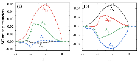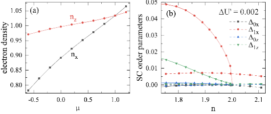研究对比了调节局域轨道间自旋耦合(ΔU′)后的结果。计算显示,局域轨道间自旋耦合的抑制会导致超导序参量被显著抑制。这印证了体系中洪特耦合及轨道间相互作用对于维持高温超导态及电子关联性至关重要。