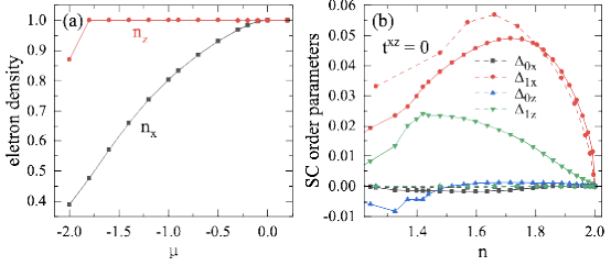 为了验证“轨道间跃迁”是导致共生行为的物理根源,研究团队人为抑制了跃迁参数(txz=0,虚线所示)。结果显示,一旦切断这一“纽带”,系统立即进入轨道选择性莫特(超导)相——即一个轨道超导而另一个绝缘。