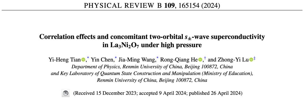 Yi-Heng Tian, Yin Chen, Jia-Ming Wang, Rong-Qiang He, and Zhong-Yi Lu, Correlation effects and concomitant two-orbitals±-wave superconductivity inLa3Ni2O7under high pressure, Phys. Rev. B 109, 165154 (2024).