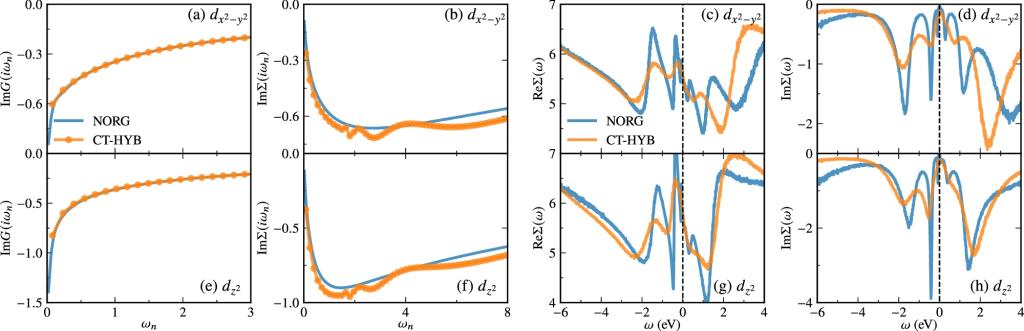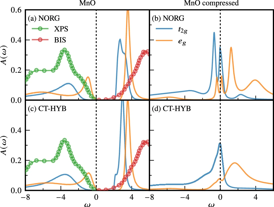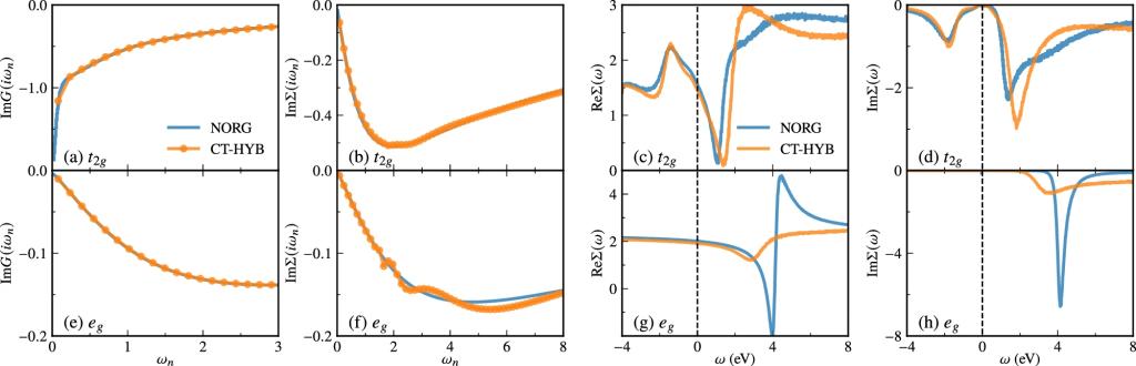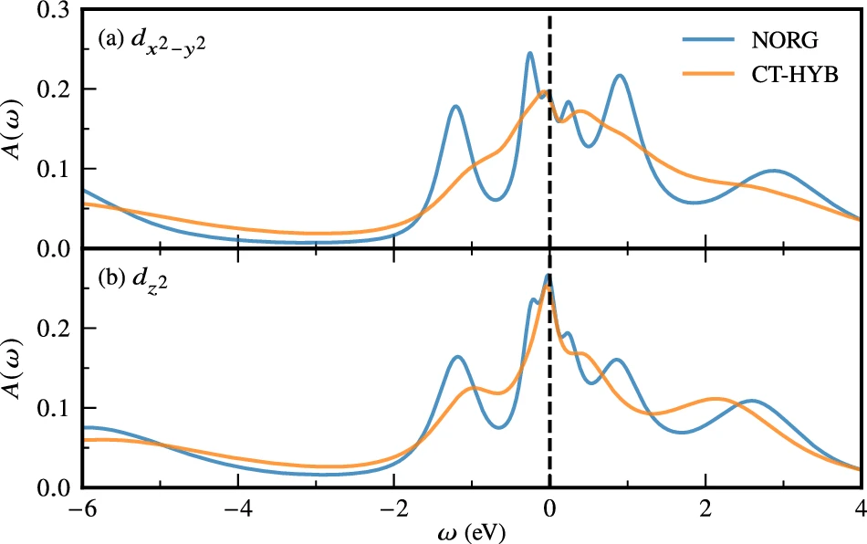 ·NORG 求解器无费米符号问题,可在零温下高精度处理多轨道强关联杂质模型,补足 CT-HYB 等 QMC 在低温及复杂杂化情形下的局限,拓展了 DFT+DMFT 的适用范围。