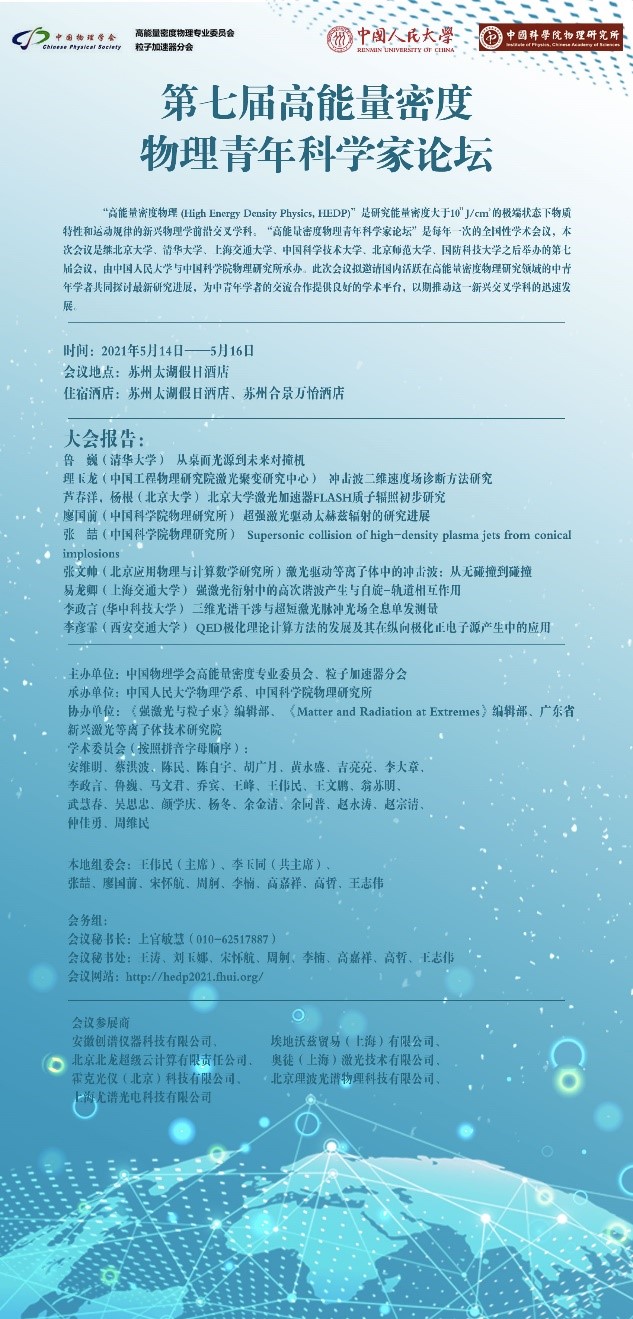2021年5月14日至2021年5月16日,由中国物理学会高能量密度物理专业委员会、粒子加速器分会主办,yl7703永利集团官网物理学系与中国科公司物理研究所承办的"第七届高能量密度物理青年科学家论坛"在江苏省苏州市成功举办。