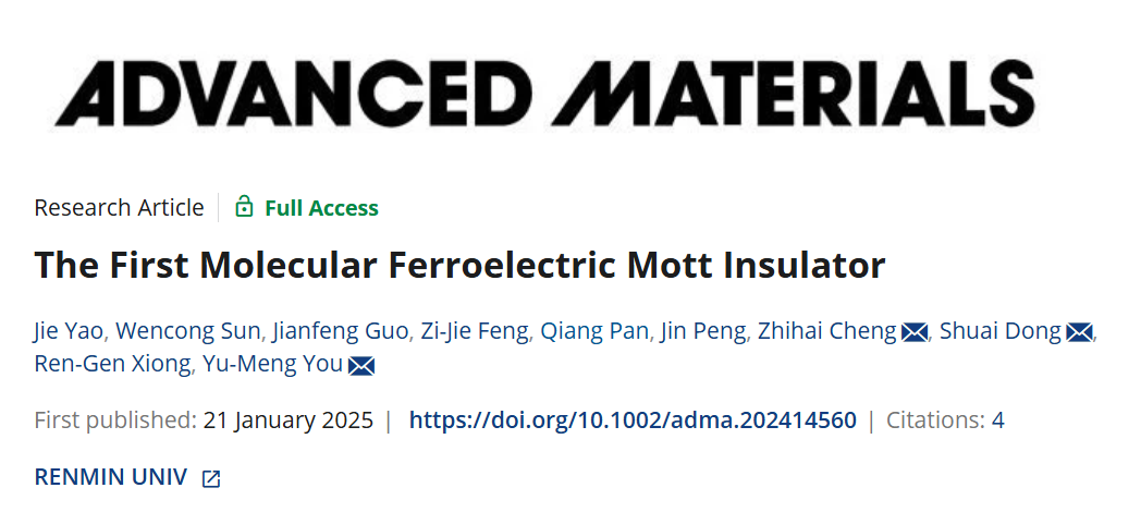 Yao, J.; Sun, W.; Guo, J.; Feng, Z.; Pan, Q.; Peng, J.; Cheng, Z.; Dong, S.; Xiong, R.; You, Y. The First Molecular Ferroelectric Mott Insulator.Adv. Mater. 2025, 2414560.