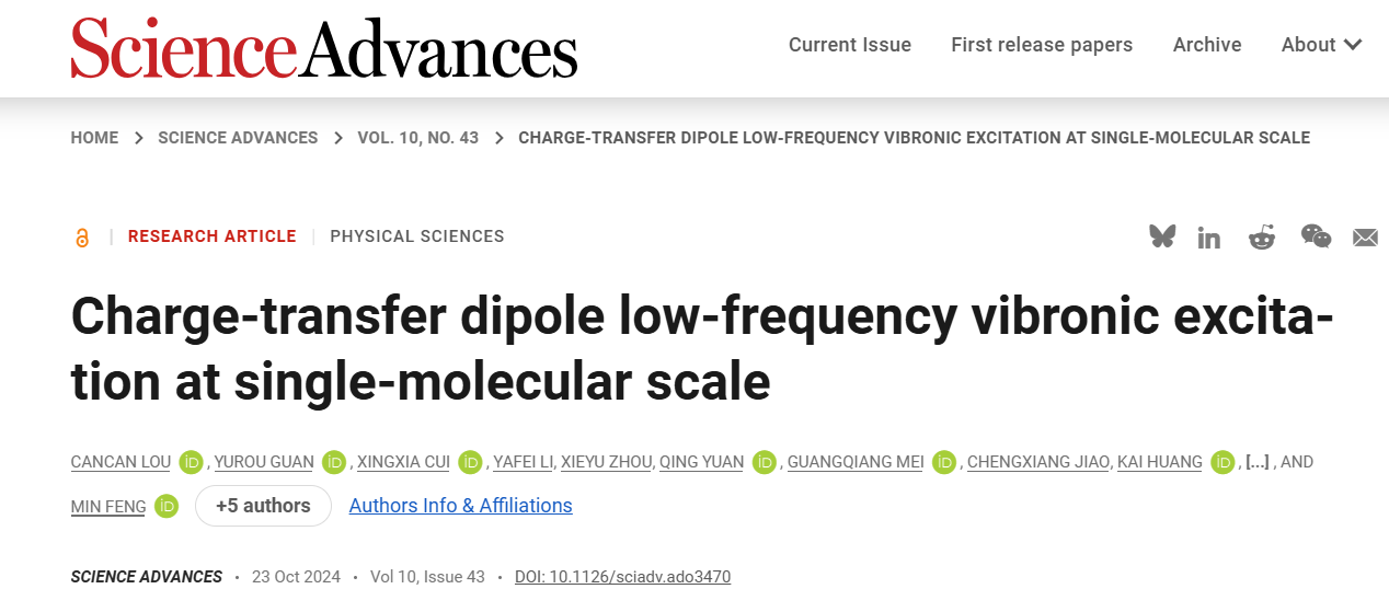 文章链接:C. Lou, Y. Guan, X, Cui et al., Charge-transfer dipole low-frequency vibronic excitation at single-molecular scale, Science Advances, DOI: 10.1126/sciadv.ado3470,https://www.science.org/doi/10.1126/sciadv.ado3470